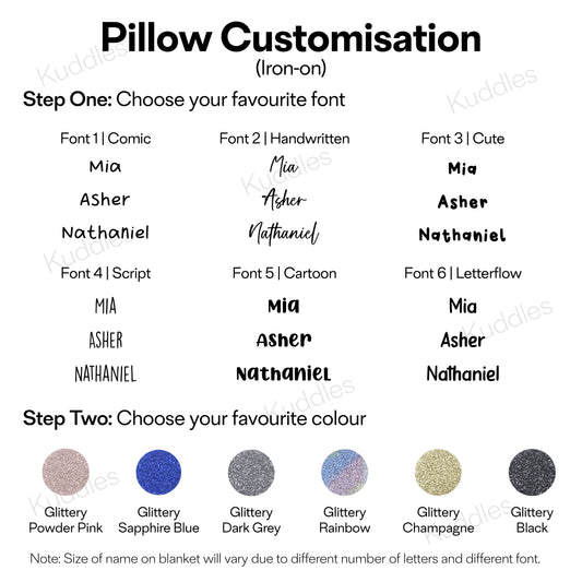 Customise your little one's name on our blanket and pillow in two ways - Iron-on or Printable (made-to-order)!