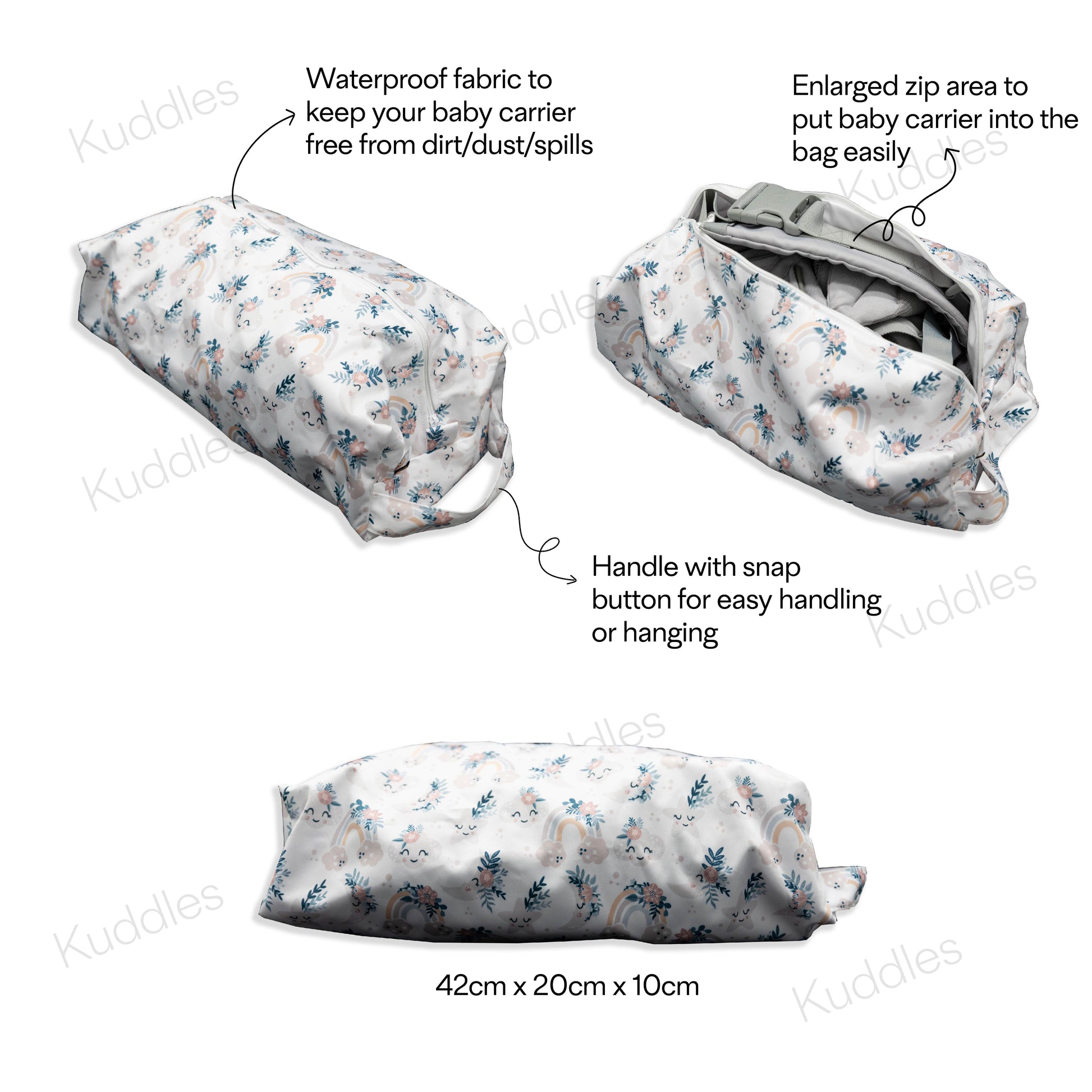Our pod bags have a main compartment lined with a layer of water-resistant polyester which makes them great for both wet and dry usage. It is great for storing your baby carriers (or anything else, really!) Keep your baby carrier compact and neat when you go! It also comes with a snap button strap for easy holding and hanging.